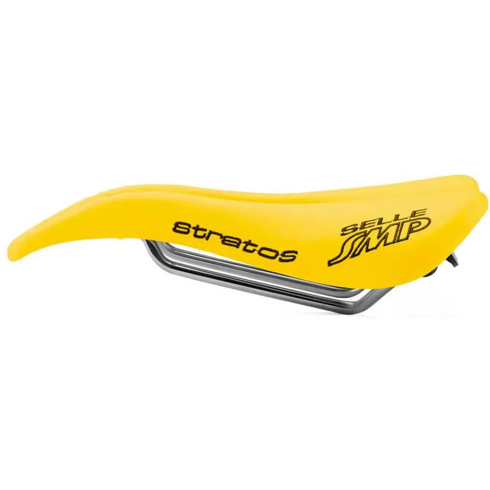 The Stratos model is the ideal seat for both intensive training and free time cycling. It uses the structure of the Composit model joined with average padding. It is covered in real leather in the black versions and microfiber in the colored versions. It has excellent “all-around” features and is particularly suited for the average pelvis. The STRATOS model has foamed elastomer padding where the ischial tuberosities and rear rest. The patented features by Selle SMP, such as the completely free central channel, the original eagle-beak nose and the raised rear give these models an interesting aerodynamic touch. In virtue of the combination of light yet comfortable padding with a body of smaller width, Stratos is the ideal solution between the Evolution and Glider models. Suited for people with a narrow or medium-sized pelvis.